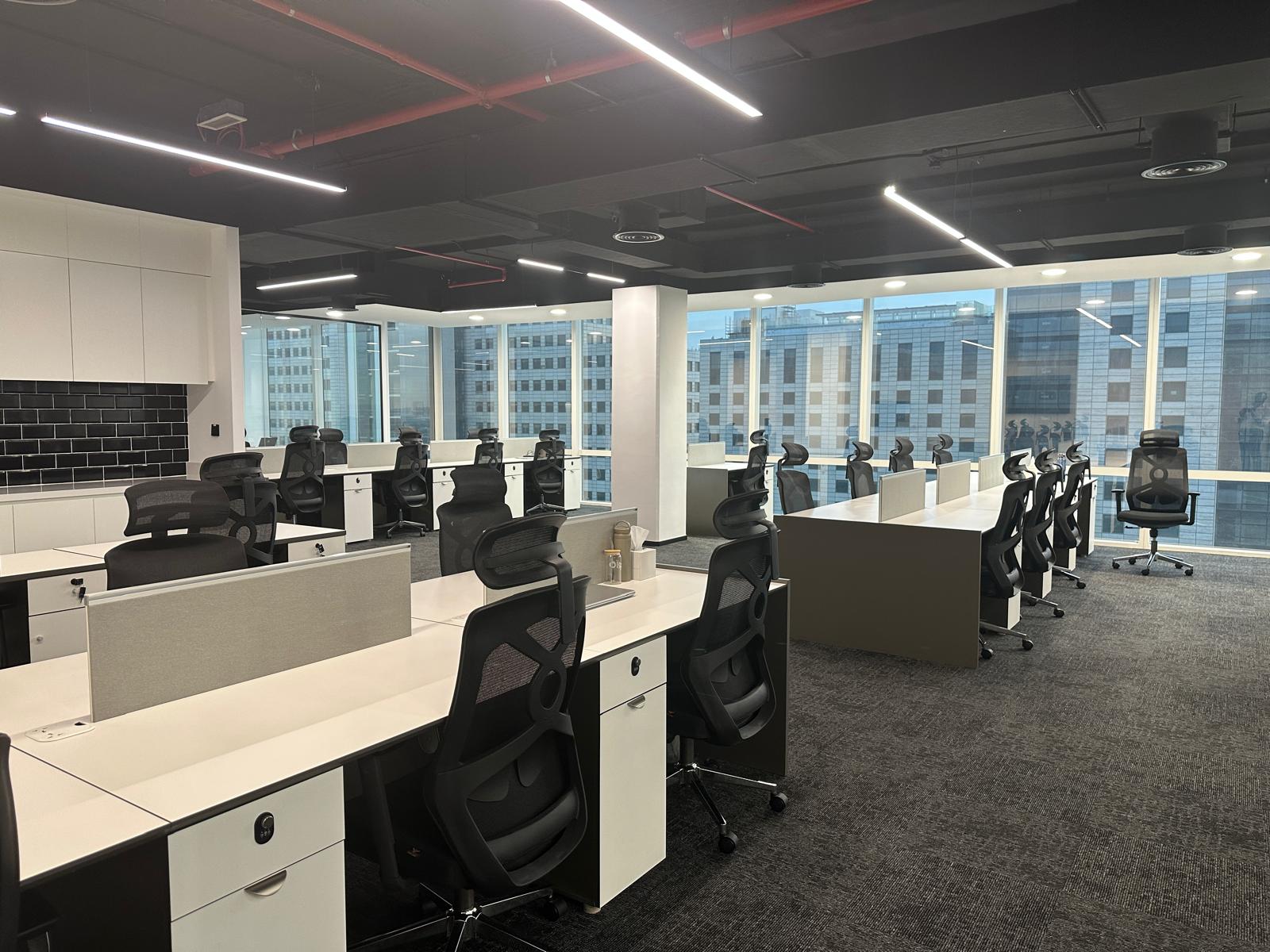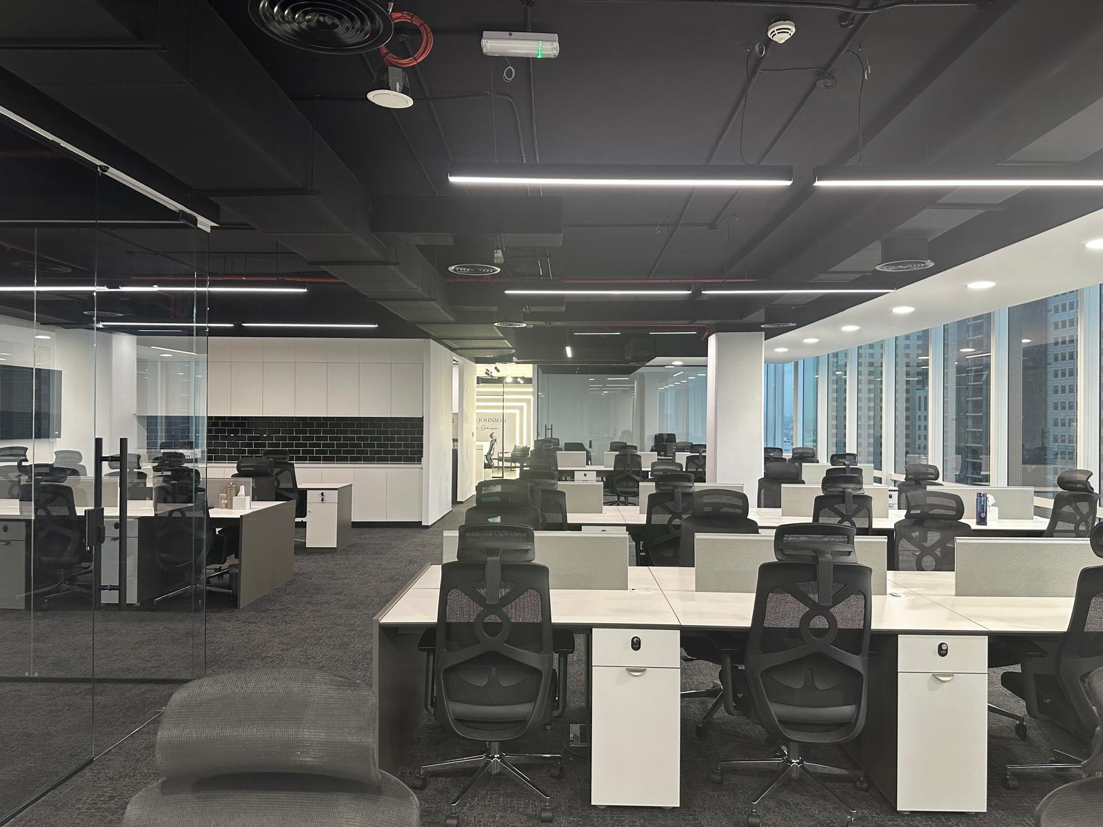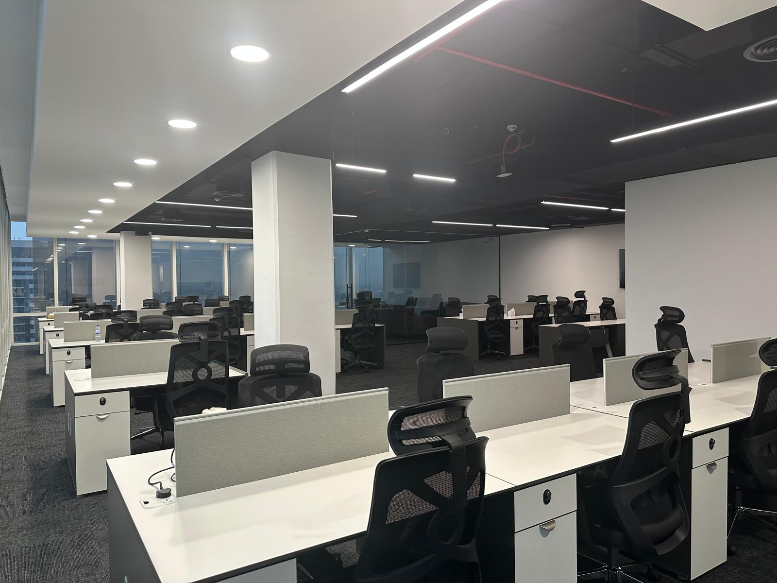 The client envisioned a modern and professional workplace that reflects sophistication while ensuring functionality and employee comfort. The requirements included a sleek reception, open-plan workstations with abundant natural light, private meeting rooms, a spacious boardroom with advanced AV facilities, and breakout spaces that encourage collaboration and interaction.